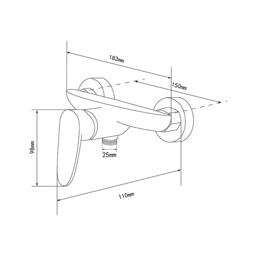 • Méretek: teljes szélesség 183 mm, falitávolság 150 mm, magasság 98 mm, kifolyó hossza 110 mm, kimeneti átmérő 25 mm