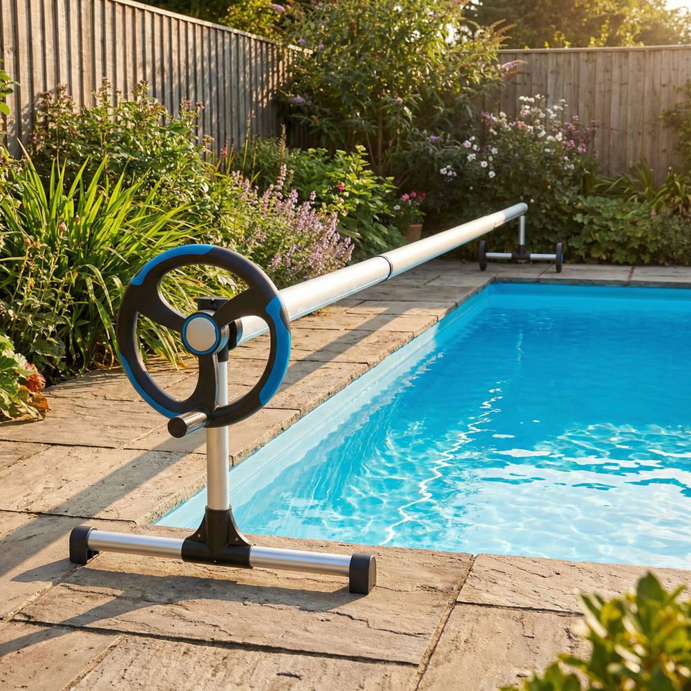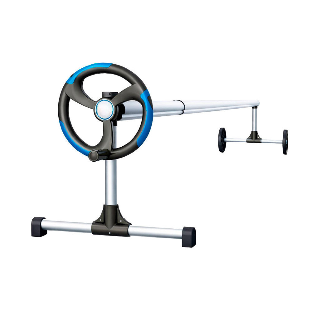 A kézi medencetakaró feltekerő praktikus megoldás süllyesztett medencék takarójának kezeléséhez. Alumínium vázzal készül, csatokkal rendelkezik, maximális terhelhetősége 60 kg. A szerkezet 105–385 cm között állítható, teljes szélessége kihúzva 3,85 m. A képek alapján kézi tekerőkerékkel és kerekes kialakítással rendelkezik.
