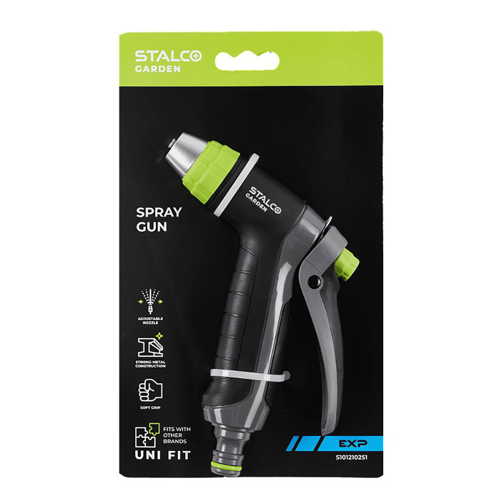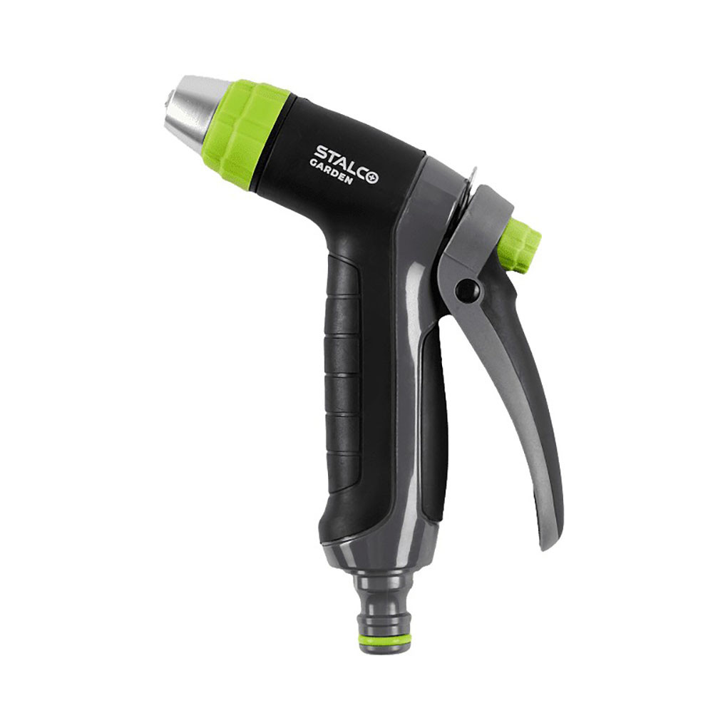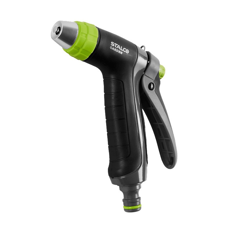 Az Állítható fém szórópisztoly EXP STALCO GARDEN egy kézi kerti locsolóeszköz, amely a vízsugár formájának szabályozásával használható növények öntözésére vagy permetezésére. A szórás típusa a fej elforgatásával állítható a koncentrált vízsugártól a szélesebb permetig. Az UNI FIT univerzális csatlakozás kompatibilis a legtöbb kerti tömlő csatlakozórendszerrel. Alumínium háza tartós, a TPR bevonat pedig kényelmes fogást biztosít a használat során.