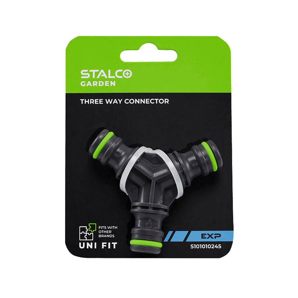 A STALCO GARDEN hármas tömlő toldó egy kerti szerelvény, amely lehetővé teszi három locsolótömlő vagy gyorscsatlakozóval ellátott tömlőelem összekapcsolását. Segítségével egy vízforrásból több tömlőág is kialakítható, vagy tömlők javítására és összekötésére is használható. Ütésálló ABS műanyagból készült, amely ellenáll a kültéri használatnak. Kertekben és öntözőrendszerekben használják locsolótömlők elosztására vagy összekapcsolására.