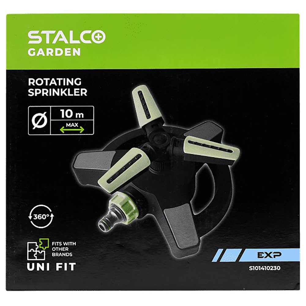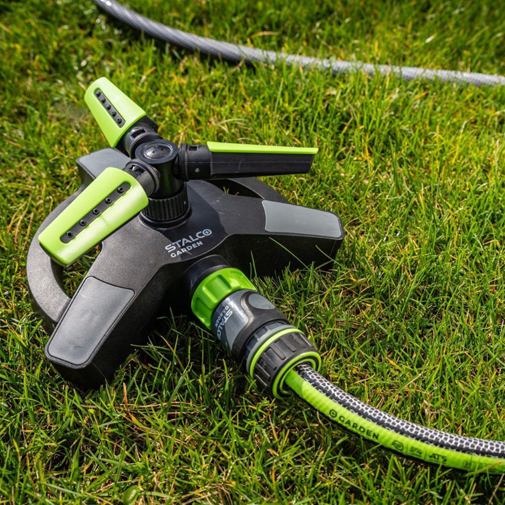 A STALCO GARDEN háromkarú talpas forgó locsoló egy kerti öntözőeszköz, amely víznyomás hatására forgó mozgással egyenletesen permetezi a vizet a kertben. Talpas kialakítása stabil elhelyezést biztosít a gyepen vagy a talajon. Elsősorban gyep, dísznövények és veteményes öntözésére használják. A locsoló kerti locsolótömlőhöz csatlakoztatható és automatikusan forgó vízpermettel öntözi a területet.