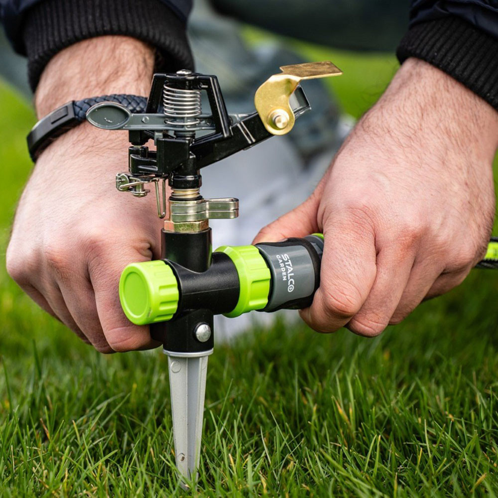 Az impulzusos fém sprinkler leszúrható STALCO Garden egy kerti locsolófej, amely egyenletes vízszórással öntözi a gyepet és a növényeket. A talajba szúrható kialakítás stabil rögzítést biztosít használat közben. Impulzusos működése nagyobb terület lefedését teszi lehetővé, így alkalmas kertek, pázsitok és veteményesek öntözésére. Az UNI FIT univerzális csatlakozó miatt más gyártók tömlőcsatlakozóival is kompatibilis.