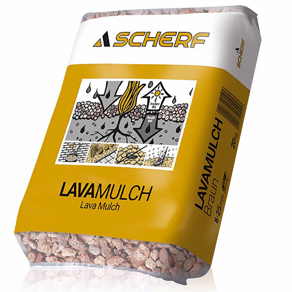 A Scherf láva talajtakaró barna 8–25 mm természetes vulkáni kőzetből készült dekoratív és funkcionális talajtakaró. Kertekben, ágyásokban, sziklakertekben és kerti utaknál használható a talaj nedvességének megőrzésére és a gyomosodás csökkentésére. Alkalmas virágcserepek, sírok, valamint kerti tavak és vízfolyások környezetének kialakítására is. Jó vízmegtartó és légáteresztő tulajdonságokkal rendelkezik, így támogatja a növények egészséges fejlődését.