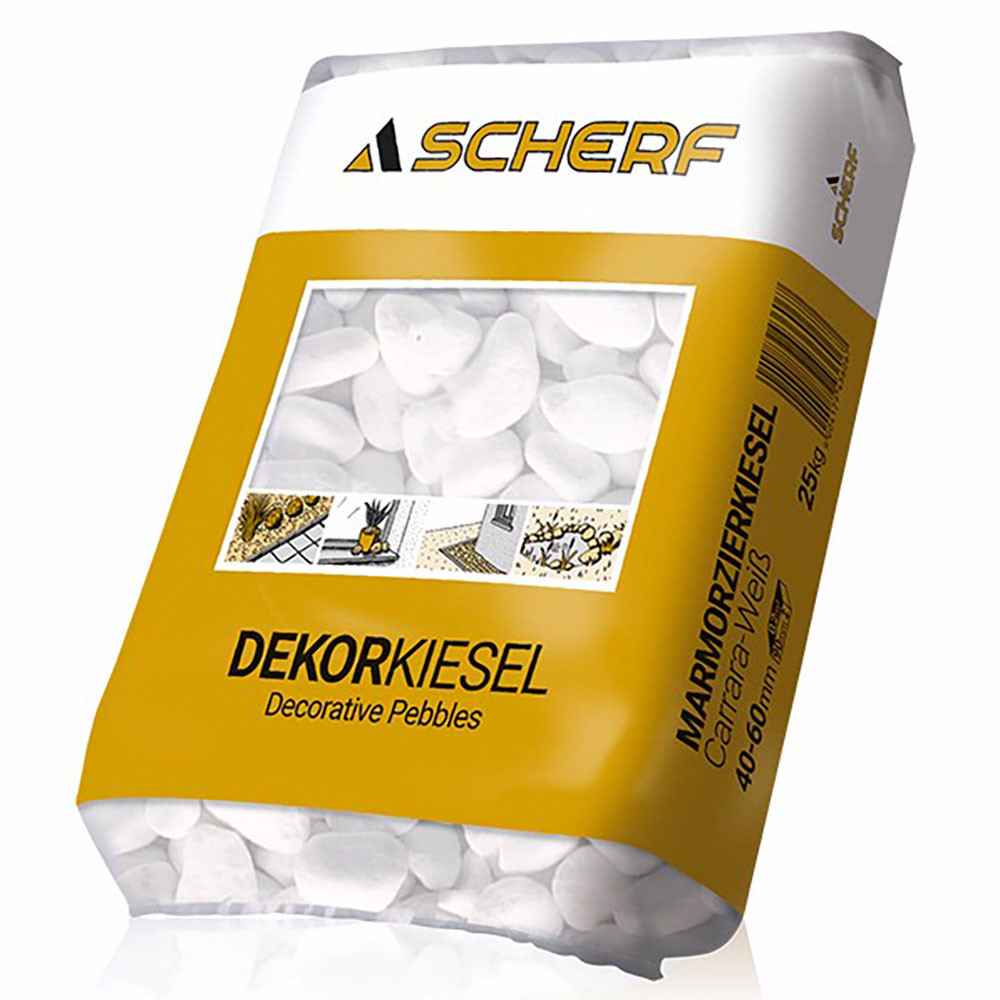 A Scherf carrarai fehér márvány díszkavics 40-60 mm természetes, lekerekített felületű dekorációs kő, amely kert- és tájépítészeti célokra használható. Alkalmas ágyások fedésére, kerti utak kialakítására, sziklakertekhez és sírkavicsként is. Használható vízfelületek, tavak és beltéri dekorációk kiegészítésére. Esztétikus és tartós megoldás kültéri és beltéri felhasználásra egyaránt.