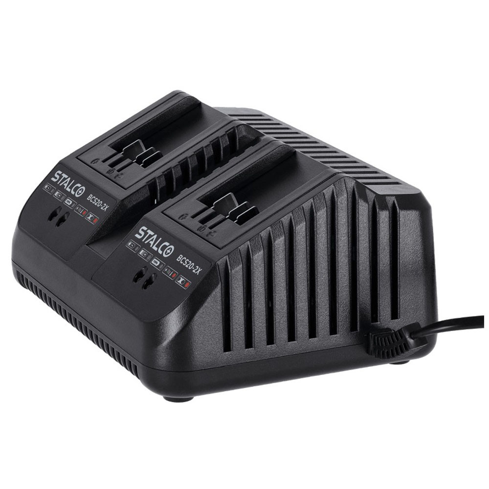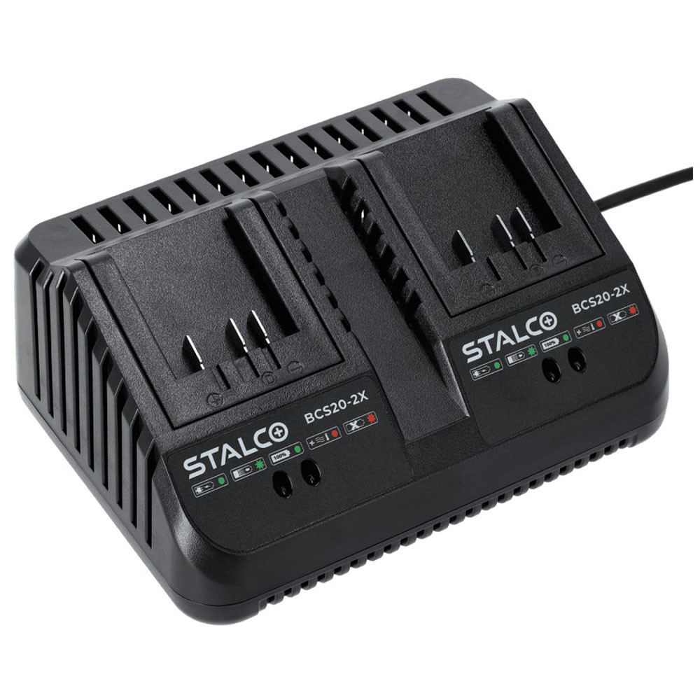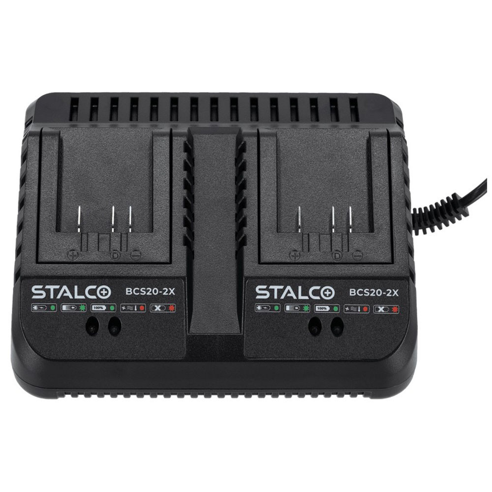 A Stalco dupla töltő 18V két akkumulátor egyidejű töltésére alkalmas töltőegység, amely a STALCO S-Volt Li-ion akkumulátorrendszerhez készült. Segítségével gyorsan feltölthetők az akkumulátoros kéziszerszámok akkui műhelyben, építkezésen vagy otthoni barkácsolás során. A két töltőnyílás lehetővé teszi több akkumulátor párhuzamos töltését, így csökkenthető a munka közbeni várakozási idő. LED visszajelző rendszer mutatja a töltés állapotát.