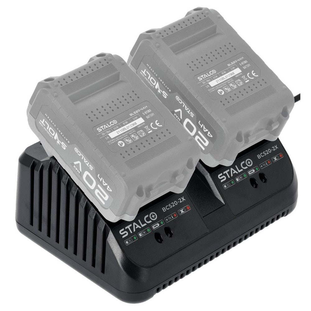 A STALCO GARDEN dupla töltő 18V egy kétfoglalatos Li-ion akkumulátortöltő, amely a kompatibilis STALCO S-Volt akkumulátorok töltésére készült.